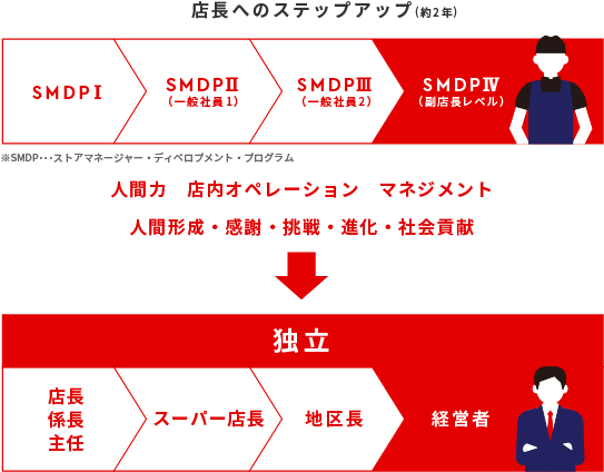 また、スタッフを束ねる店長においては、*SMDPと言う独自の育成のプログラムによって、魅力的な店舗を運営するスーパーゼネラリストとしての技術が備わっております。