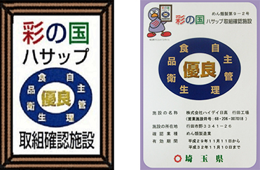 この度、行田工場が彩の国ハサップを取り入れた優良施設として、埼玉県から行田工場の全ての施設(麺類・そうざい・食肉・その他)が認められました。